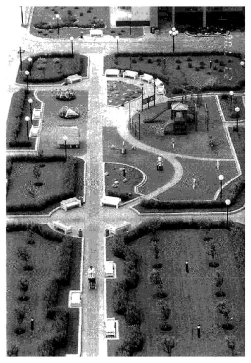 дорожки и элементы озеленения: деревья, кустарники, газоны и цветники. По своей
