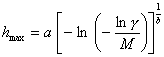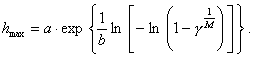 где а - параметр масштаба распределения, определяемый по средней глубине разрушения; b - параметр формы, характеризующий разброс значений h. Параметр формы определяется по коэффициенту вариации (см. табл. 2), значения которого зависят от вида разрушения. При оценке степени разрушения оборудования и прогнозировании его надежности необходимое определять максимальную глубину разрушения hmax. Величина hmax при прочих равных условиях зависит от площади поверхности, подвергающейся разрушению. Доказательство этого факта приведено в работе Новаковского В. М. «К стандартной научной системе коррозионно-электрохимических понятий и терминов», опубликованной в ж. «Защита металлов», т. 16, № 3, 1980, с. 250 - 264. Выведем формулу для расчета hmax. В соответствии с формулой (1) для максимально допустимой величины разрушения hmax вероятность ее непревышения при измерении на единичном участке поверхности S0 будет равна: