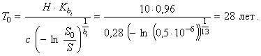 где S0 и S определены в п. 2.6; «bt» и «Kbt» определяют по табл. 2 в зависимости от uht: hmax определяется по результатам обследования по формуле (6); uh - коэффициент вариации, соответствующий hmax. В частном случае, при постоянной скорости разрушения «с»: 3.8.2. Расчет установленной безотказной наработки T0y осуществляют по формуле: где T0 определяется по п. 3.8.1; uт - определяется по п. 3.7.2. 3.8.3. Расчет вероятности безотказной работы Р(t) осуществляют по формуле: