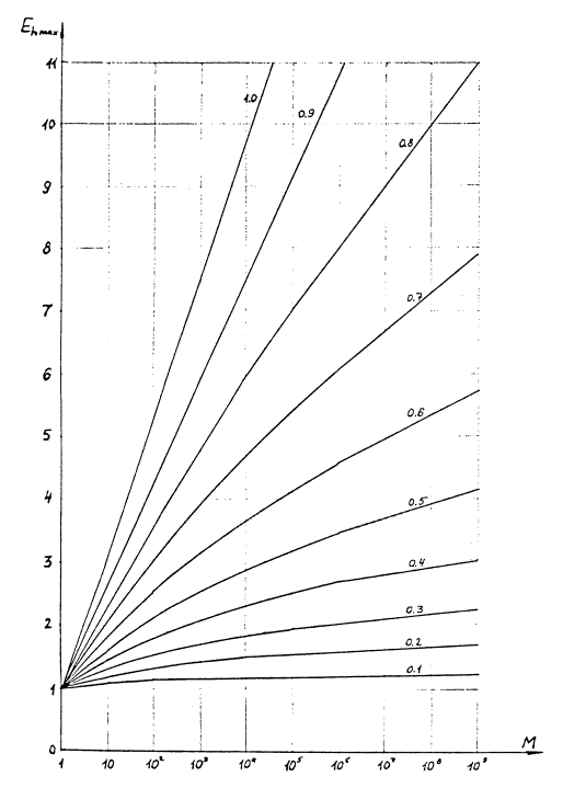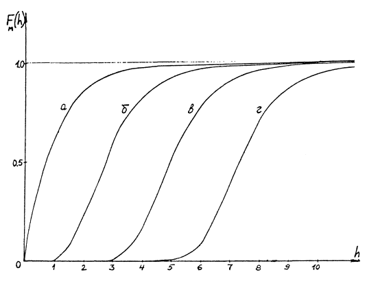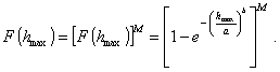 На «М» участках поверхности вероятность h < hmax будет равна: Функция распределения F(h) глубин разрушения поверхности Черт. 1. Для поверхности площадью S величина М = S/S0. Зависимость (3) положена в основу расчета вероятности безотказной работы поверхности по критерию непревышения глубины ее разрушения предельно допустимой величины. Подстановкой в формулу (3) заданной достоверности оценки g = F(hmax), получим выражение для расчета максимальной глубины разрушения на поверхности заданной площади: Величина М = S/S0 зависит как от площади обследуемой поверхности S, так и от величины поверхности S0, приходящейся на одно измерение. Величина S0 зависит от вида инструмента, используемого для измерений глубины разрушения. Например, если глубина разрушения определяется путем измерения остаточной толщины стенки оборудования ультразвуковым толщиномером, то площадь измеряемого участка поверхности будет равна площади контакта измерительной головки с измеряемой стенкой. При измерении щуповыми инструментами площадь определяется площадью сечения щупа. Минимальное значение, которое может принимать величина S0, определяется радиусом корреляции глубин разрушения по поверхности металла. Как установлено в работе (Отчет № гос. рег. 01840031823) величина этого радиуса составляет до 1 - 2 величин среднего размера зерен металла и может быть ограничена величиной порядка 0,1 мм2. На черт. 2 показаны функции распределения, построенные с использованием формулы (4) при некоторых значениях «М». Видим, что с возрастанием площади «М» поверхности математическое ожидание максимальной глубины разрушения увеличивается, а разброс ее значений уменьшается. Указанное свойство уменьшения разброса максимальных значений с увеличением М может быть использовано для резкого уменьшения числа необходимых измерений (то есть уменьшения их трудоемкости) при обеспечении требуемой точности результатов. Это возможно в тех случаях, когда максимальная глубина разрушения на некотором участке поверхности легко выявляется визуально. Функции распределения максимумов FM(h) из М значений: а)
