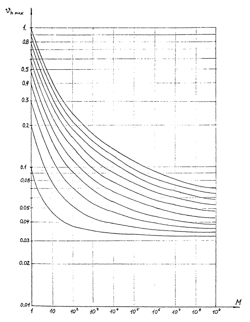 = 1000. Черт. 2. Зависимость математического ожидания максимума от числа М значений случайной величины, распределенной по закону Вейбулла. Величины коэффициентов вариации исходных распределений указаны около кривых. Черт. 3. Зависимость коэффициента вариации максимума от числа М значений случайной величины, распределенной по закону Вейбулла Черт. 4. На черт. 3 и 4 представлены зависимости математического ожидания и коэффициента вариации максимума из М значений величины, распределенной по закону Вейбулла. При использовании приведенных зависимостей достаточно измерить максимальную глубину разрушения на нескольких участках известной площади (М по п. 2.6.2) и определить (по п. 2.4) коэффициент вариации этих глубин. По полученным данным на черт. 4 определяется кривая, соответствующая данному виду разрушения, и на черт. 3 может быть определена максимальная глубина разрушения для поверхности любой площади. Расчет hmax по формуле (4) при больших