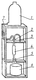 Бюретка 4 с двухходовым краном 2 и одноходовым краном 5, номинальной вместимостью 100 см3,