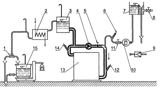ПРИЛОЖЕНИЕ И(рекомендуемое) Схемы испытаний1 - трехходовой кран; 2 - охладитель; 3 - компенсационный бак; 4 - циркуляционный насос; 5 - клапан управления I; 6, 12, 14 - термометры; 7 - бак постоянного уровня; 8 - клапан управления III; 9 - подсоединение к распределительной трубе постоянного давления; 10 - водомер; 11 - клапан управления II; 13 - испытуемый котел; 15 - сосуд для взвешивания Рисунок И. 1 - Испытательный стенд с прямой