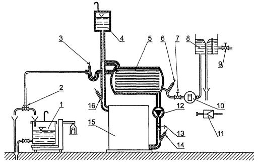 рециркуляцией 1 - сосуд для взвешивания; 2 - трехходовой кран; 3, 6, 14, 16 - термометры; 4 - расширительный сосуд (вне системы циркуляции); 5 - теплообменник; 7 - клапан управления II; 8 - бак постоянного уровня; 9 - клапан управления III; 10 - водомер; 11 - подсоединение к распределительной трубе постоянного давления; 12 - циркуляционный насос; 13 - клапан управления I; 15 - испытуемый котел Рисунок И.2 - Испытательный стенд с