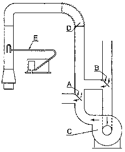 100 мм А и В - перегородки для получения восходящей и обратной тяги; С - вентилятор; D- гибкий участок; Е - трубка Пито для измерения скорости потока Рисунок И.5 - Испытание котла при особых