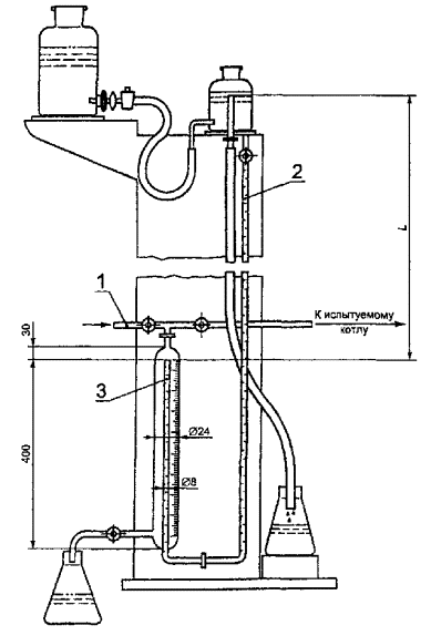 условиях тяги 1 - сжатый воздух; 2 - градуированная шкала; 3 - измерительный сосуд Рисунок И.6 - Устройство для проверки
