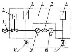 герметичности газового тракта 1, 6, 7, 10 - краны; 2 - испытуемый образец; 3, 5 - воздушный резервуар объемом 1 дм3; 4 - отсек постоянной температуры; 8, 9 - манометры Рисунок И.7 - Проверка герметичности