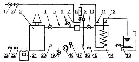компонентов газового тракта (метод потери давления) 1, 4, 10, 15, 19,23 - запорно-регулирующие клапаны; 3 - испытуемый котел; 2, 22 - регуляторы расхода газа; 5, 11, 12, 16, 20 - термометры; 6- предохранительный клапан; 7 - тепловой компенсатор; 8 - ротаметр; 9 - регулирующий клапан; 13 - весы; 14 - теплообменник; 17 - расширительный бак; 18 - циркуляционный насос; 19 - дренаж; 21 - газовый счетчик Рисунок И.8 - Испытательный стенд для