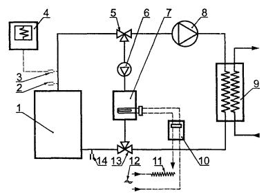 испытательному стенду в соответствии с рисунком И.9. Насос 8 останавливают, а теплообменник 9 отключают с помощью трехходовых кранов 5, 13. Включают циркуляционный насос