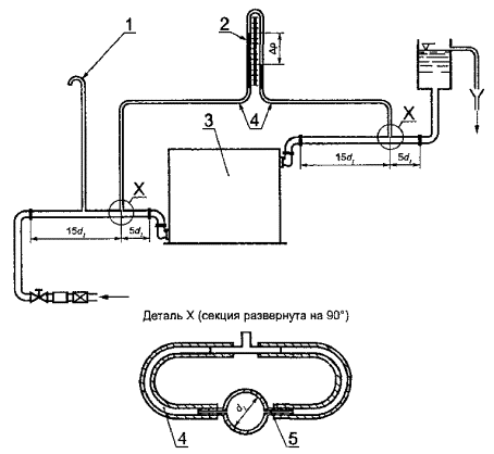 определения потерь тепла в окружающую среду при неработающих горелках 1 - труба для сброса воздуха, 2 - дифференциальный манометр, 3 - котел, 4 - гибкая труба; 5 - отверстие диаметром 3 мм без внутренней резьбы Рисунок И.10 - Устройство для определения