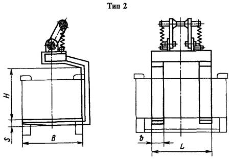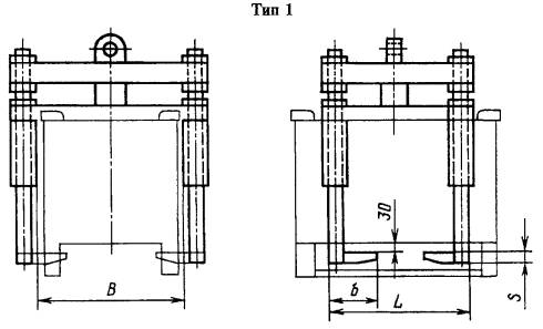 1, 2). 2. Стандарт устанавливает четыре типа грузозахватных устройств: 1 - с лапами; 2 - с вилами; 3 - рычажно-клещевые; 4 - с крюками. 3. Основные параметры и размеры грузозахватных устройств типа 1 должны соответствовать указанным на черт. 1 и в табл. 1 и 3. Черт. 1 Примечание. Чертеж не определяет конструкцию грузозахватных