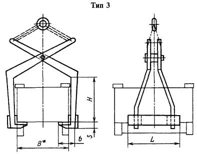 Пример условного обозначения грузозахватного устройства типа 2 с L = 450 мм, В = 600 мм, Н = 560 мм и грузоподъемностью 0,25 т: Устройство грузозахватное 2-45-60-56-0,25 ГОСТ 15539-81 3, 4. (Измененная редакция, Изм. № 1, 2). 5. Основные параметры и размеры грузозахватных устройств типа 3 должны соответствовать указанным на черт. 3 и в табл. 2 и 3. * В рабочем положении. Черт. 3 Примечание. Чертеж не определяет конструкцию грузозахватных