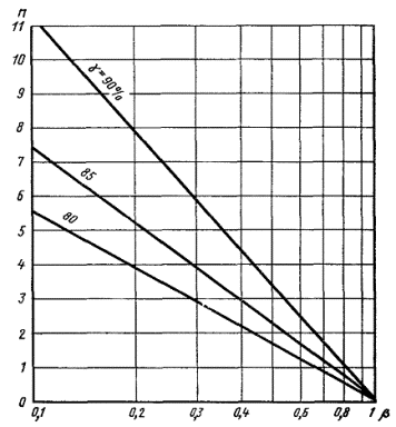 2. Выбор количества образцов при периодических испытаниях на надежность При периодических испытаниях гидро-пневмо-смазочного оборудования проверяют, как правило, следующие показатели надежности: среднюю наработку до отказа, средний ресурс и (или) гамма-процентный ресурс. Число образцов определяем по известной формуле для биноминального распределения числа отказов при условии, что число отказавших изделий равно нулю. где q3=1-g; g - заданная вероятность гамма-процентного ресурса (в долях единицы); b - условная вероятность приемки партии изделий с долей дефектных единиц, равной q3 (условный риск потребителя). Безусловный риск потребителя где р(q³q3) - безусловная вероятность того, что вероятность отказа в партии больше или равна заданной q3. Для оценки р можно допустить С учетом (11) и (12) формула (10) примет вид Решив уравнение (13) относительно п и выразив q3 через g получим (знак Ù можно опустить) Принимая во внимание, что медианный ресурс (g=0,5) для нормального распределения наработок до предельного состояния близок к среднему, подсчитаем количество образцов, необходимое для контроля среднего ресурса (средней наработки до отказа) при риске потребителя b=0,1
