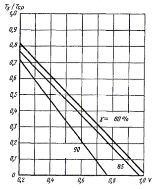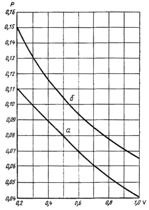 Для других наиболее распространенных законов распределения величина р зависит от назначения коэффициента вариации V рассматриваемого распределения. При этом вероятность gср, соответствующая среднему ресурсу (средней наработке до отказа), равна: для логнормального закона распределения где F0(×) - табулированная функция нормированного нормального закона распределения: для закона распределения Вейбулла где Г(×) - гамма-функция; k - показатель степени параметр распределения Вейбулла, зависящий от коэффициента вариации. Используя выражения (2) и (3), подсчитываем по формуле (1) значения р при п=3. Зависимости, представленные на черт. 1, показывают, что для рассмотренных распределений недостоверность р оценки среднего ресурса меньше, чем в случае нормального распределения. Из выражения (1) при условии с=0 следует, что наработку до первого отказа изделия, отказавшего первым по счету (при условии, что все три образца начали испытывать одновременно), принимают за оценку средней наработки до отказа изделий. Наработку изделия, достигшего предельного состояния первым по счету (при условии, что все три образца начали испытывать одновременно), принимают за оценку среднего ресурса изделий. Оценку гамма-процентного ресурса изделий рассчитывают исходя из среднего, используя графические зависимости, приведенные на черт. 2 - 4 для различных законов распределения, как функции коэффициента вариации V при заданных значениях вероятности g гамма-процентного ресурса. Для изделий общемашиностроительного применения, в которых применяют подшипники, рекомендуемое значение g=90%, если последнее не задано потребителем. В других случаях величина g выбирается, исходя из возможности сравнения значения данного показателя с соответствующими показателями аналогичных изделий отечественного и зарубежного производства. Зависимости для подсчета гамма-процентного ресурса (черт. 2 - 4) построены на основании следующих формул. Для нормального закона распределения наработок до предельного состояния