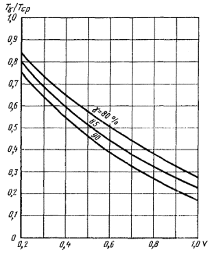 для нормального закона распределения наработок до предельного состояния Черт. 2 Зависимость отношения Tg/Tср от коэффициента вариации V и