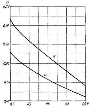Для других законов распределения произведена оценка риска b в зависимости от коэффициента вариации V при числе испытуемых образцов n=2. Формула для подсчета b получена путем разрешения уравнения (14) относительно b с подстановкой g=gcp и с учетом формул (2) и (3), т.е.
