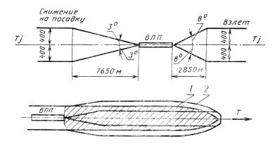 для взлета самолета по идеальной прямой: 2 - то же, с учетом отклонения