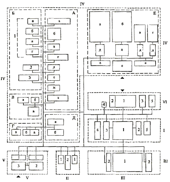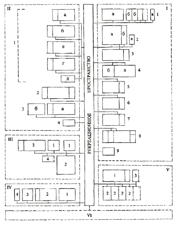- хозяйственные мастерские, 3 - склады и кладовые VI. Входная и обслуживающая группа помещений: 1 - вестибюль, 2 - гардероб,