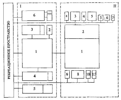 Рис. 1 Функциональная структура ДДТ I. Группа помещений массовой работы: 1 - зал массовых мероприятий,