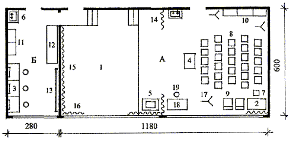 компьютерной техники (а - кабинет с лаборантской, б - компьютерный класс), 4 -