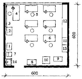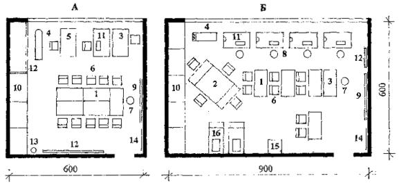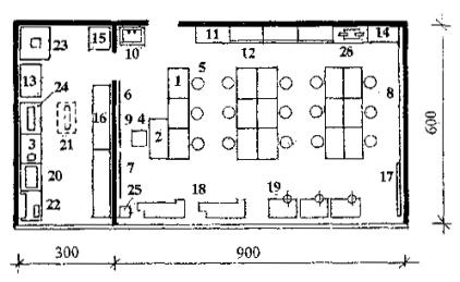 шкаф-сейф; 15 - шкаф вытяжной; 16 - стеллаж деревянный; 17 - стенд для