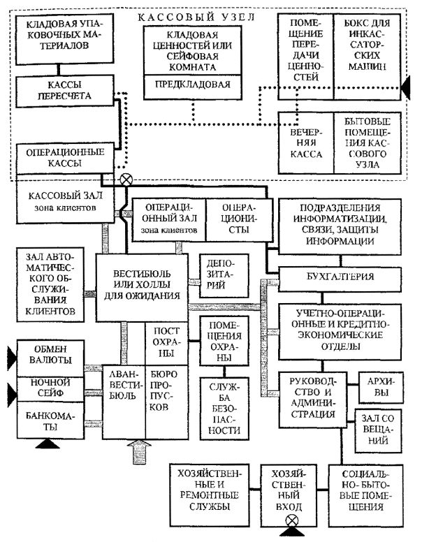 Рис. 3.1. СХЕМА ВЗАИМОСВЯЗИ ПОМЕЩЕНИЙ КОММЕРЧЕСКОГО БАНКА 4. Требования к помещениям кассового и операционного блоков зданий банков4.1. Кассовый узел.Согласно МГСН 4.10-97 кассовый узел коммерческого банка включает следующие основные помещения: - кладовую ценностей с предкладовой или сейфовую комнату с предсейфовой; - операционные кассы (кассовые кабины); - кассы пересчета банкнот и монет; - вечернюю кассу; - помещение по приему-выдаче денег инкассаторам и бокс для инкассаторских машин; - комнаты для хранения личных вещей и отдыха кассиров. 4.1.1. В здании коммерческого банка могут быть устроены одна или несколько кладовых ценностей для хранения отечественной и иностранной валюты и ценных бумаг. Как правило, каждая из кладовых должна иметь собственную предкладовую. В случаях, когда это целесообразно, особенно в условиях реконструкции, одна предкладовая может предусматриваться на две и более кладовых. Возможно также в пределах одной защитной оболочки кладовой выделение отсеков для разных видов хранения при помощи решетчатых или глухих перегородок. Кладовые ценностей оборудуются стационарными металлическими стеллажами с решетчатыми дверьми или специальными металлическими шкафами для хранилищ. В крупных кладовых ценностей (площадью более 100 м2) возможно применение контейнерного хранения ценностей на передвижных платформах или хранение на передвижных стеллажах для компактного хранения. На рис. 4.1 - 4.4 приведены примеры планировки кладовых с предкладовыми при различных способах хранения ценностей. В соответствии с требованием ЦБ РФ для коммерческих банков (Положение «О порядке ведения кассовых операций в кредитных организациях на территории Российской Федерации» № 56 от 25 марта 1997 г.), по которому защитная оболочка кладовой ценностей должна иметь класс защиты от взлома не ниже V по ГОСТ Р50862-96, и по аналогии с требованиями к кладовым ценностей для расчетно-кассовых центров устойчивость к взлому защитной оболочки кладовой должна быть не ниже следующих классов: V - в кладовых площадью до 100 м2; VI - в кладовых площадью 100 - 200 м2; VII - в кладовых площадью свыше 200 м2. Толщину конструкций защитной оболочки кладовой и других ограждающих конструкций в зависимости от материала и требуемого класса устойчивости к взлому см. в Приложении 1. При организации сейфовой комнаты для хранения ценностей должны применяться несгораемые сейфы класса устойчивости к взлому не ниже IV (ГОСТ Р50862-96) и имеющие соответствующий сертификат. Они могут размещаться в помещениях, не оборудованных фибробетонной оболочкой и бронедверью. На рис. 4.5 приведена планировка сейфовой комнаты с предсейфовой. 4.1.2. Операционные кассы (кассовые кабины) могут выходить своим фронтом непосредственно в кассовый зал или же перед каждой кассой могут организовываться индивидуальные кабины для пересчета денег клиентами. На рис. 4.6 - 4.9 приведены примеры организации нескольких операционных касс: кассовой кабины со стандартным набором оборудования, кассовой кабины уменьшенной площади для стесненных условий реконструкции, операционной кассы с дополнительным боковым окном для выдачи крупных сумм наличности непосредственно в помещение пересчета денег клиентами и кассовой кабины увеличенной площади для старшего кассира. На рис. 4.10 и 4.11 показаны операционные кассы с индивидуальными каб