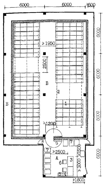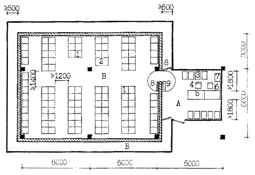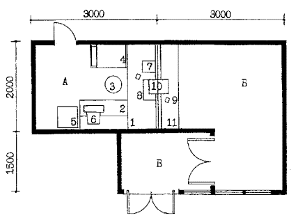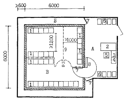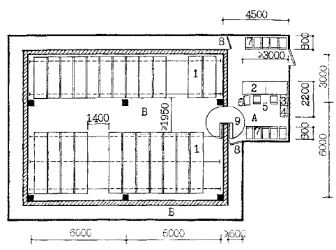 металлическая дверь 9 - бронедверь Рис. 4.4. КЛАДОВАЯ ЦЕННОСТЕЙ С ПРЕДКЛАДОВОЙ /ВАРИАНТ 4/ А - сейфовая Б - предсейфовая 1 - сейф 2 - стол