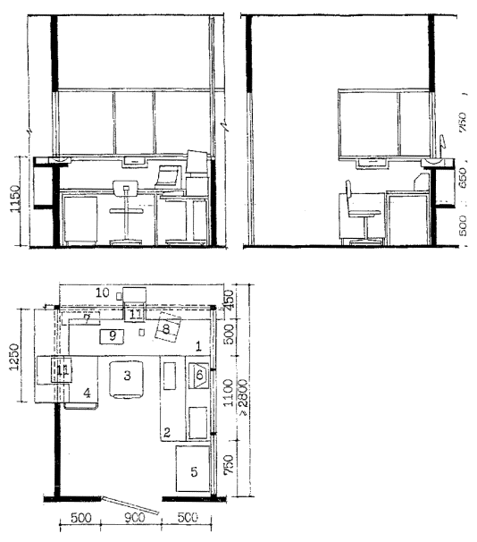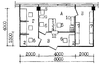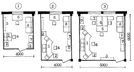 металлический шкаф для документации, расходных материалов и оперативного архива 6 - стол 7 - тумба 8 - диван 9 -