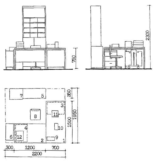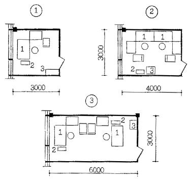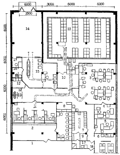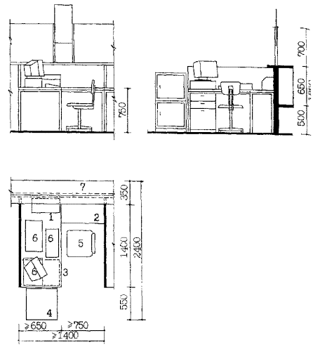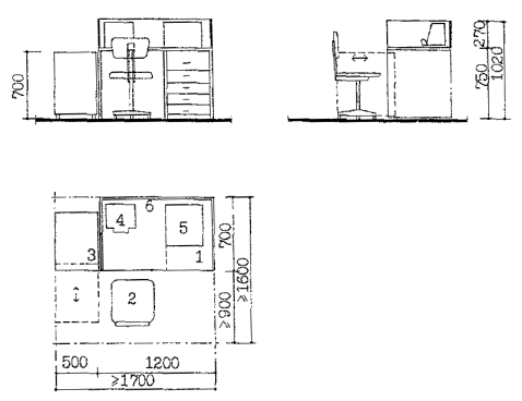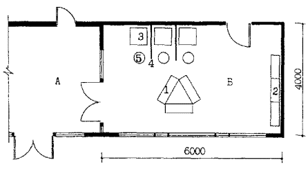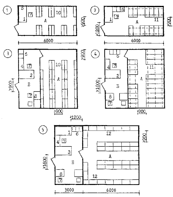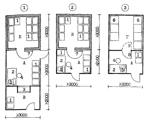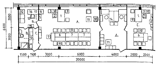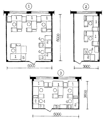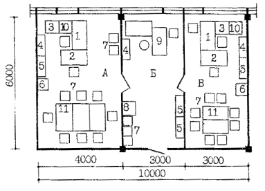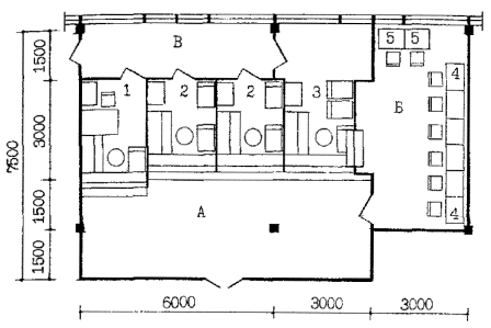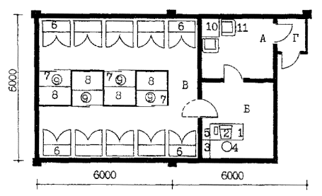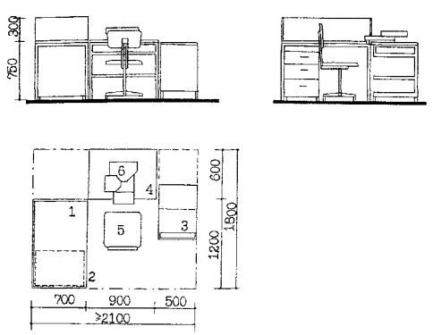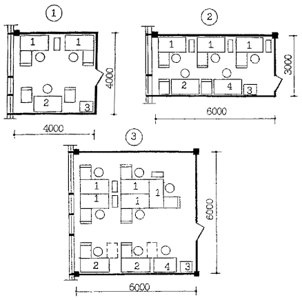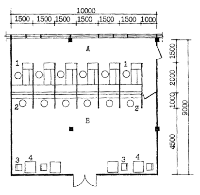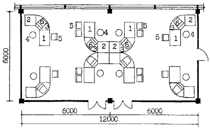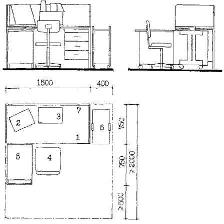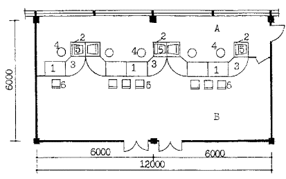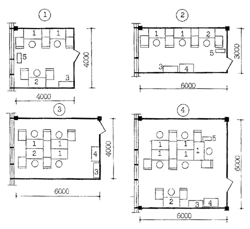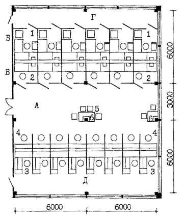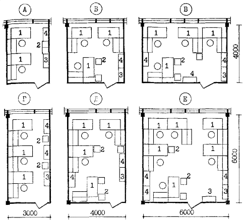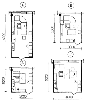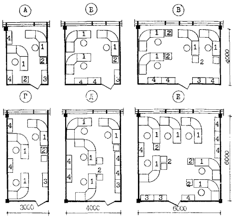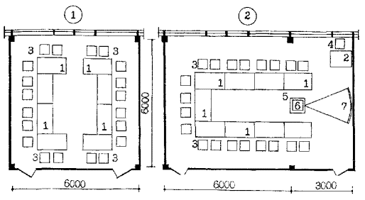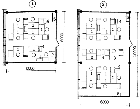 столы 3, 4 - тумбы 5 - шкаф-картотека 6 - контейнер