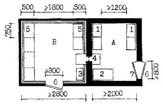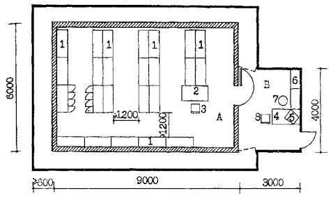 металлическая дверь сплошная 7 - дверь решетчатая Рис. 4.5. СЕЙФОВАЯ КОМНАТА С ПРЕДСЕЙФОВОЙ 1 - рабочий