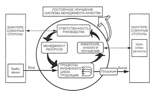 процессов, основанного на объективном измерении. Приведенная на рисунке 1 модель системы менеджмента качества, основанная на процессном подходе, иллюстрирует связи между процессами, представленными в разделах 4-8. Эта модель показывает, что заинтересованные стороны играют существенную роль при определении входных данных. Мониторинг удовлетворенности заинтересованных сторон требует оценки информации о восприятии заинтересованными сторонами выполнения их требований. Приведенная на рисунке 1 модель не детализирует процессы.