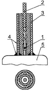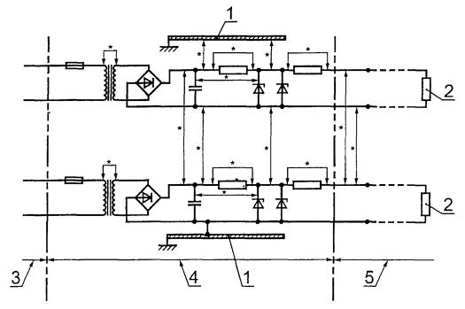 1 - свободная поверхность; 2 - герметизация; половина значения из пункта 3 таблицы 4 при минимальном значении 1 мм; 3 - компонент, герметизирующий материал не должен проникать; 4 - герметизирующий материал, толщина не задана; 5 - металлическая или изоляционная оболочка; для металлической оболочки толщину не указывают, (см. 6.4), для изоляционной оболочки толщина изоляции должна соответствовать значению пункта 4 таблицы 4