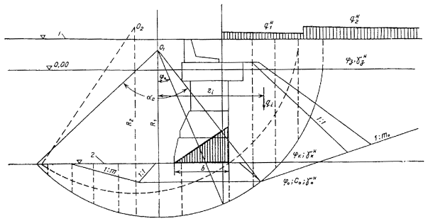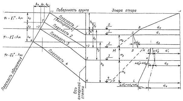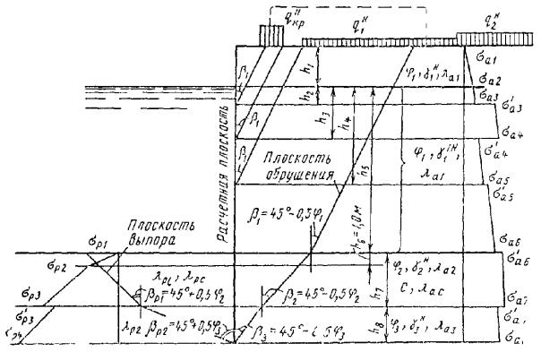 пересечения плоскости обрушения с расчетным горизонтом воды; плоскость 4 - произвольно. Ординаты эпюры отпора