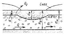 Н - глубина воды на стесненном участке; d - глубина промерзания за пределами стесненного участка; dM - глубина промерзания на стесненном