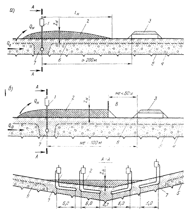 Примечание. Q - расход поверхностных или грунтовых вод выше стесненного