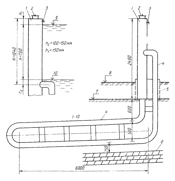 труба d=80 мм; d=5 мм; 5 - кожух для защиты установки от затопления наледью; 6 -