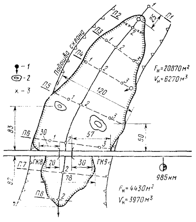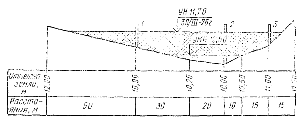 Поперечный профиль наледи: 1, 2, 3 - ледомерные рейки Динамика развития