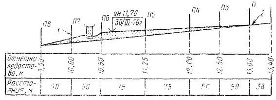 Продольный профиль наледи по оси водотоков: 1 - мерные верхи;