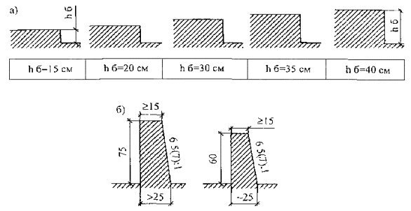 удерживающая способность составляет 400 кДж (ширина парапета по низу ³0,5 м). Парапет высотой 60 см (см. п. 4.1) с поручнем на стойке высотой 40 см (общая высота 1,0 м) может быть установлен на сооружениях без тротуаров или служебных проходов на дорогах IV категории с легкими и затрудненными условиями движения (рис. 3 б). Парапетные ограждения с поручнем общей высотой 1,1 м могут быть применены на сооружениях с тротуарами на дорогах II категории (при опасных условиях движения) и I категории при четырех полосах движения с легкими и затрудненными, а при изменении сечения - с опасными условиями движения. Рис. 3. Рекомендуемые типовые парапетные