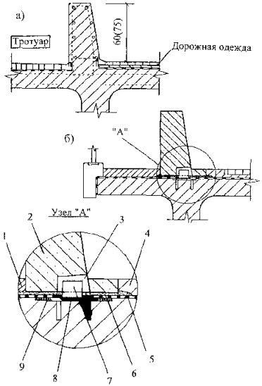 вырезана); 9 - пропитанный бетону границы с закладной деталью Как и в предыдущем случае, возможно сборное и монолитное исполнение железобетонных блоков. Область применения парапетных ограждений с иной формой лицевой поверхности определяется дополнительными расчетами или испытаниями. 4.3. Парапетное