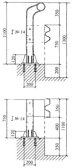 ограждение на мостовых сооружениях без тротуаров Типовая конструкция (Н=75 см; i=7 (6,5):1) может быть применена по краям пролетных строений без тротуаров при условии установки на парапет поручня в виде жесткой балки на стойках (рис. 3). Балки могут быть выполнены из коробчатого профиля, двутавра или трубы с сечением, имеющим момент сопротивления W»100 см3 (предпочтительней использование трубы диаметром не менее 120 мм). Момент сопротивления стоек должен находиться в пределах 50≤Wст≤100 см3. Крепление стойки к парапету осуществляют с помощью болтов М-20 с "глухой" гайкой, прижимающих фланец к закладной детали. На один сборный блок парапета устанавливают не менее двух стоек, шаг стоек не должен превышать 3 м. Указанную конструкцию ограждения общей высотой 1,1 м с удерживающей способностью E=300*) кДж устраивают при следующих условиях движения на дороге: а) IV категории - опасные; б) III категории - любые, в) II категории - легкие и затрудненные; г) I категории - легкие. *) При изменении сечения и