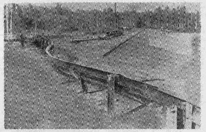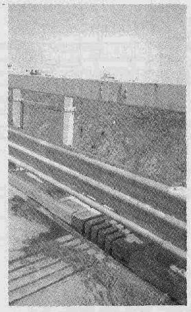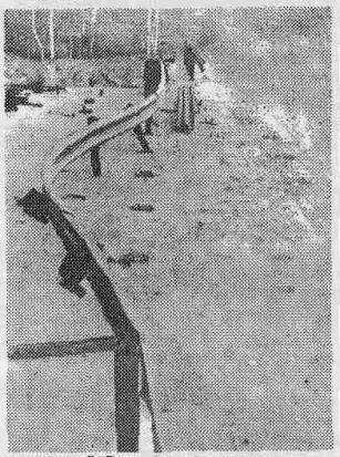 Рис. 16. Пример применения жестких барьерных ограждении на виадуках во Франции: а -магистраль Е-15. Высота ограждения 1,0 м,- цоколь h=20 см, Е≈500 кДж; б - сопряжение жесткого барьерного ограждения с полужестким (магистраль Е-60) Конструкции «ТрансЭкоСтрой» (рис. 15) разработаны на базе французского варианта (рис. 16), но отличаются от них наличием амортизаторов, обеспечивающих смещение до 10 см. Из-за жестких стоек (W>150 см3) указанное ограждение относится ближе к жестким, чем к полужестким. Отличие имеется и в расположении продольных элементов: за рубежом они размещены на расстоянии, обеспечивающем стыковку с обычным профилем (рис. 15). Высокую удерживающую способность обеспечивают и конструкции «Южуралавтобан». Это достигается за счет частого расположения стоек (а=1,0 м и реже а=2,0 м) и значительной жесткости верхнего направляющего элемента. В отличие от предыдущей конструкции, в ней в качестве нижнего направляющего элемента используется обычная двухволновая балка, крепящаяся к недеформируемой консоли (рис. 17). 4. Новые отечественные и зарубежные конструкции, имеющие разрешение на применение4.1. Отечественные конструкции мостовой группы, имеющие сертификат соответствияИз новых отечественных конструкций ограждений на мостовых сооружениях общей сети автомобильных дорог находят применение ограждения, разработанные фирмой ООО «ТрансЭкоСтрой» с тремя направляющими элементами и мощной стойкой из гнутого профиля (рис. 15), сертификат соответствия № 0092420 [15]. Ограждение прошло натурные испытания на полигоне и имеет следующие характеристики при шаге стоек 2 м: Энергоемкость, кДж .............................................................................. 500 Прогиб ограждения на высоте 0,55 м при расчетном наезде, м ....... 0,45 Прогиб стойки при расчетном наезде, м ............................................. 0,3 Вес 1 пог. м конструкции, кг................................................................. 90 Рис. 17. Конструкция фирмы «Южуралавтобан» 4.2. Импортные конструкции ограждений, разрешенные к применению на автомобильных дорогах общей сетиИз импортных конструкций ограждений, прошедших сертификацию в России, на мостовых сооружениях дорог общей сети могут быть использованы следующие конструкции. 4.2.1. Конструкция «Фракассо-3N» (Италия) с трехволновой балкой высотой 500 мм Податливые консоли длиной 600 мм расположены на стойках из гнутого швеллера 120х80х5 мм (рис 18), [16]. Шаг стоек может быть принят 3,0 м и 1,5 м (сертификат OOROSS.1T.MT18.C0003). Рис. 18. Ограждение «Фракассо-3N» перед испытанием на полигоне (энергоемкость ≈500 кДж) Консоль - составная из двух частей, имеет вырез и перфорацию в верхней и нижней частях для увеличения энергоемкости за счет облегчения ее деформации. Принцип работы конструкции: автомобиль контактирует с трехволновой балкой, и на начальной стадии деформации консоли происходит прорезание нижней перфорации, консоль разворачивается и частично деформируется; начальная стадия деформации стойки сопровождается