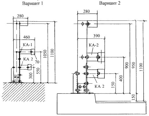 700 кДж, а = 1,5м Рис. 12. Барьерные ограждения фирмы «Фракассо» 6.4. Ограждения фирм «ТрансЭкоСтрой» и «Южуралавтобан»Ограждение «ТрансЭкоСтрой» (рис. 13) высотой 1,1 м с тремя направляющими элементами в виде гнутых коробчатых профилей (на уровне 0,3 м 0,55 м и 1,05 м от верха покрытия) целесообразно применять в сооружениях на дорогах I технической категории при: · наличии тротуаров или служебных проходов при опасных условиях движения на дороге; · наличии тротуаров или служебных проходов при затрудненных условиях на дороге с шестью и более полосами движения; · специальном армировании плиты пролетных строений и бетонном приливе в месте крепления стоек. Ограждения «ТрансЭкоСтрой» лучше всего устраивать на мостовых сооружениях в случаях, если на участке автомобильной дороги применены аналогичные конструкции или если на участке дороги за пределами сооружения ограждения не требуются. Наиболее целесообразно их использовать в городских условиях, на сооружениях без тротуаров и служебных проходов с легкими условиями движения при шести и более полосах движения, а также на сооружениях с тротуарами и служебными проходами с затрудненными и опасными условиями движения при числе полос, большем или равном шести. Рис. 13. Ограждения с тремя направляющими профилями и жесткой стойкой («ТрансЭкоСтрой») КА - консоль-амортизатор Ограждения «Южуралавтобан» используют балку в виде волнового профиля Е с увеличенной жесткостью и недеформируемую консоль на высоте 0,55 м по центру балки. Частое расположение стоек (а = 1,0) и достаточно жесткая верхняя балка дали возможность поднять энергоемкость до 400 кДж при Н = 1,1 м и 520 кДж при Н = 1,05 м. Ограждения фирмы «Южуралавтобан» с одним направляющим элементом (Е = 350 кДж) целесообразно устанавливать на цоколь с тем, чтобы общая высота ограждения не была меньше 0,75 м.