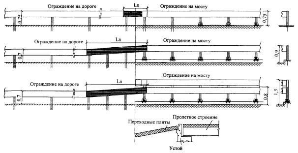 ограждение на мостовом сооружении при ширине полосы безопасности 1 м При отсутствии ограждений на дороге мостовые ограждения заканчиваются начальным (перед мостом по ходу движения) и конечным (за мостом) участками. В пределах указанных участков торец направляющей балки смещается к бровке земляного полотна дороги с уклоном не более 1:10 (до 1:20). Общая длина одной нитки ограждения в зоне мостового перехода должна определяться требованиями табл. 6 и приниматься не менее следующих величин (табл. 7). Таблица 7