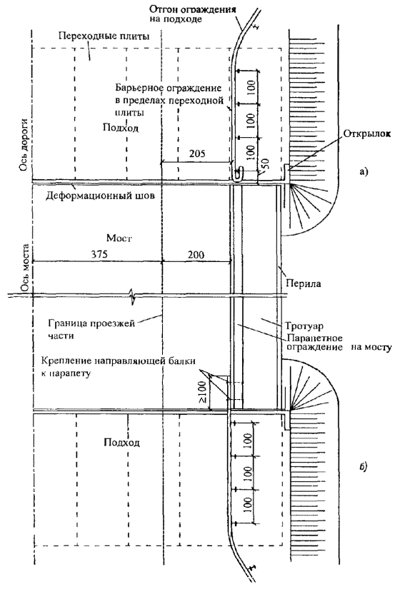 Барьерные ограждения. При величине перемещения Δр ≤ 50 мм в направляющей балке над деформационным швом в пролетном строении (далее ДШ), которая принимается укороченной - длиной не более 3 м, или в специальной вставке между ближайшими к шву стойками все стыковые отверстия (9 шт. в каждом стыке, если стык устроен напротив стойки) устраивают овальными по ГОСТ 26804-86. Рис. 18. Схема сопряжения парапетного ограждения на мосту с барьерным ограждением на подходах применительно к габариту Г-11,5 (размеры в сантиметрах) Рис. 19. Схема сопряжения балок над ДШ при Δ ≤ 500 мм (а) и Δ> 500 мм (б), вид со стороны тротуара (размеры в сантиметрах): 1 - направляющая балка; 2 -