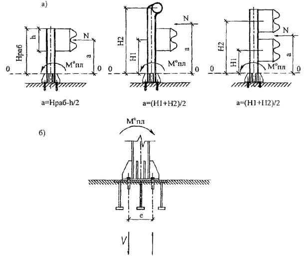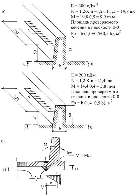 то есть допускается появление трещин в бетоне. При этом напряжения в арматуре могут достигать нормативных сопротивлений на растяжение. Расчет узлов крепления стоек барьерных ограждений предусматривает две основные проверки: - по прочности болтов; - по прочности анкеровки закладных деталей. Рис. 21. Расчетные горизонтальные воздействия на бордюры Рис. 22. Схемы к расчету парапетных ограждений по прочности сечений (а) и по креплению (б) *) При энергии воздействия 400 кДж