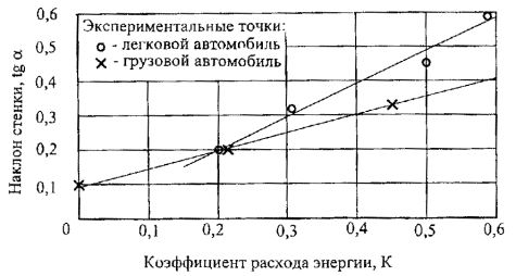1)Предел Е по критерию поперечной перегрузки (в остальных случаях - по моменту переезда автомобиля через бордюр). 1.2. Парапетные ограждения.В различные годы применяли парапетные ограждения высотой 55 и 60 см. Высота парапетных ограждений в современных типовых проектах составляет 75 см [4]. Все эти конструкции имеют наклон лицевой поверхности в пределах 6:1¸7:1. При наезде грузового автомобиля на ограждение с наклонной стенкой поперечная энергия движения автомобиля расходуется на смятие шины, разворот и подъем колеса, смещение кузова вследствие сопротивления подвески и трения шины о покрытие дороги и парапет. Экспериментально установлено, что работа, затраченная на подъем колеса по наклонной поверхности ограждения, равна примерно половине энергии движения автомобиля Е в момент контакта. С уменьшением крутизны наклона колесо сможет подняться на большую высоту, а с увеличением - на меньшую; при этом уменьшается и работа, затрачиваемая на подъем колеса. Установленная испытаниями зависимость величины подъема колеса от угла наклона стенки ограждения представлена графически на рис 3. По оси абсцисс дан коэффициент расхода энергии К