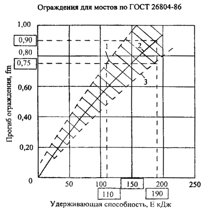 При расчетном наезде автомобиля на барьерное ограждение [9] склонение верха стоек, а следовательно сужение габарита служебного прохода или тротуара шириной 1,0 м, не должно превышать 0,5 м. При ширине тротуара более 1,0 м сужение пешеходного габарита не должно превышать 0,75 м. Указанные ограничения вызваны необходимостью обеспечения безопасности прохода пешеходов. Исходя из условия минимального повреждения автомобиля, конструктивно должно быть обеспечено требование ограничения смещения колеса за лицевую плоскость стойки величиной "в" (в - ширина ската). В частности, при расчетном наезде на стандартное ограждение с шагом стоек 2 м (Е = 150 кДж) переднее колесо грузового автомобиля смещается поперек оси ограждения после контакта со стойкой еще на величину около 0,3 м. Удерживающая способность ограждений должна соответствовать требованиям табл. 3. Таблица 3