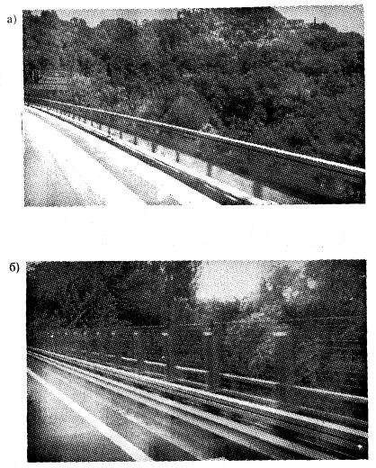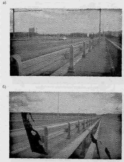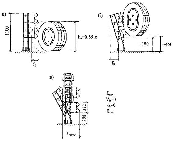 Рис. 11. Примеры применения стандартных ограждений с усиливающей трубой на мостах с четырьмя (а) и шестью (б) полосами движения Ограждения с усиливающим элементом в виде трубы были установлены на некоторых мостах дороги М-20 С.Петербург - Киев - Одесса, сооружениях магистрали М-4 «Дон» и М-6 «Балтия» в 1990-1995 гг., а также на сооружениях автомагистрали М-4 участка МКАД-Кашира в 1999г. Ограждение с двумя двухволновыми профилями обеспечивает безопасность наезда легковых автомобилей, которые удерживаются нижним стандартным профилем на стандартном амортизаторе.1 Наезд грузовых автомобилей малой грузоподъемности (15-25% от общего числа наездов) воспринимается уже двумя рядами профиля без существенных отклонений стойки. И только наезд грузовых автомобилей средней и большой массы (до 10% от общего числа наездов) гасится деформацией двух рядов балки с амортизаторами и стойками. При этом допустимое отклонение стойки меньше, чем в случае с одним направляющим элементом, поскольку кинематика деформации ограждения в данном случае иная. В частности, на первой стадии деформируются только амортизаторы (рис. 12 а), после этого отклоняются стойки и колесо грузового автомобиля поднимается на нижний ряд планки и воздействует на стойку с повышенного уровня (рис. 12 б). Предельное отклонение верха стойки в этом случае составляет 0,6-hpa6, где hpa6 - рабочая высота стойки, равная при высоте ребер жесткости 100 мм hpa6 = 1,1 м - 0,1 м = 1,0 м (уст = 1,0·0,6 = 0,60 м). Максимальное возможное отклонение верхней балки при этом составляет 0,90-0,95 м при шаге стоек 2,0 м и до 1,0 м при шаге стоек 3 м. Указанное отклонение складывается примерно из следующих перемещений элементов: - стойки - 0,65 м (0,65 м); - амортизатора - до 0,2 м (0,2 м); -
