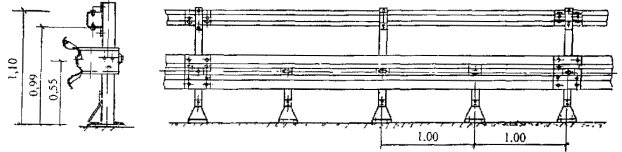 Рис. 10. Рекомендуемые конструкции ограждений с двумя направляющими балками и разной высотой цоколя 6.3. Ограждения фирмы «Фракассо» (рис. 11)Ограждения «Фpaкacco-3N» высотой 1,1 м с трехволновой направляющей балкой рекомендуется применять в сооружениях с тротуарами на дорогах с затрудненными условиями движения (шесть и более полос) или опасными условиями движения (четыре полосы) при шаге стоек 3,0 м (см. рис. 12 а). При опасных условиях движения на дорогах с шестью полосами шаг стоек принимают равным 1,5 м и ограждения устанавливают на парапете высотой 20 см. В этом случае полная высота ограждения 1,3 м. Ограждение с Н = 1,3 м (т.е. на бордюре высотой 20 см) может быть устроено на мостовых сооружениях с шестью и более полосами движения при опасных условиях движения на автомобильной дороге. Ограждение "Фракассо-3N-1500" высотой 1,5 м (см. рис. 12 б) рекомендуется устраивать в сооружениях без тротуаров и служебных проходов при опасных условиях движения с шагом стоек: - а = 1,5 м - при шести полосах и более; - а = 3,0 м - при четырех полосах движения, а также при затрудненных условиях движения на дорогах с шестью полосами и более. Рис. 11.